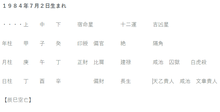 私は命式を展開してみるまでは、彼女は今年世間を騒がし続ける、東原亜希や泰葉、小室哲哉などの「K・Y族」ではないかと思ってました。