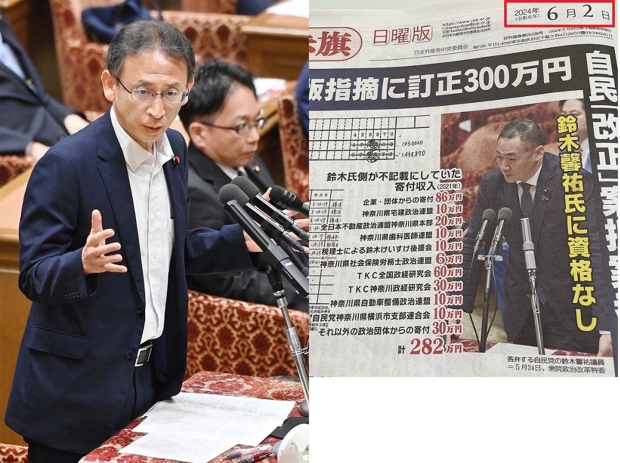画像は鈴木の裏金(300万円、記載漏れ回数10回)をスクープした赤旗と国会で追及する共産党の塩川議員