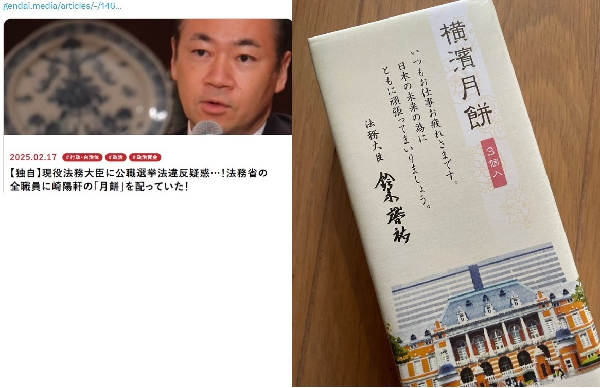 法務省関係者によると、東京・霞が関の本省で勤務する職員に対し、中国菓子の月餅(げっぺい)を配った。3個入りの箱に、鈴木氏のメッセージが印字された包装紙がついていたという。(転載ここまで)
