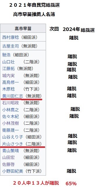 この時の推薦人20人中13人(約65%)が次回の2024年の総裁選の時に推薦人名簿から「離脱(拒否)」しました。