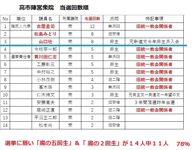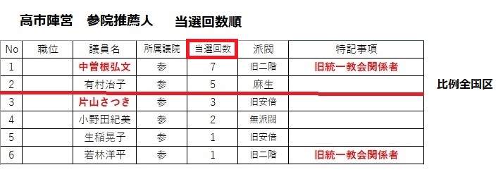 生き残った議員もほぼ全員統一教会との密接交際者で神道政治連盟、日本会議、保守団結の会(青山繫晴一派)とカルト色が異常に強いのが特徴です。