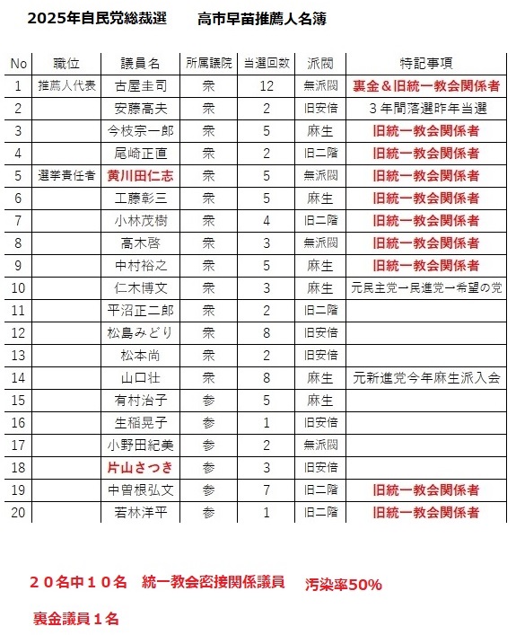 綺麗に「大掃除完了」と思いきや今回は統一教会議員汚染率がなんと50%で古屋圭司と言う古参の裏金議員が推薦人代表で潜り込んでいました。