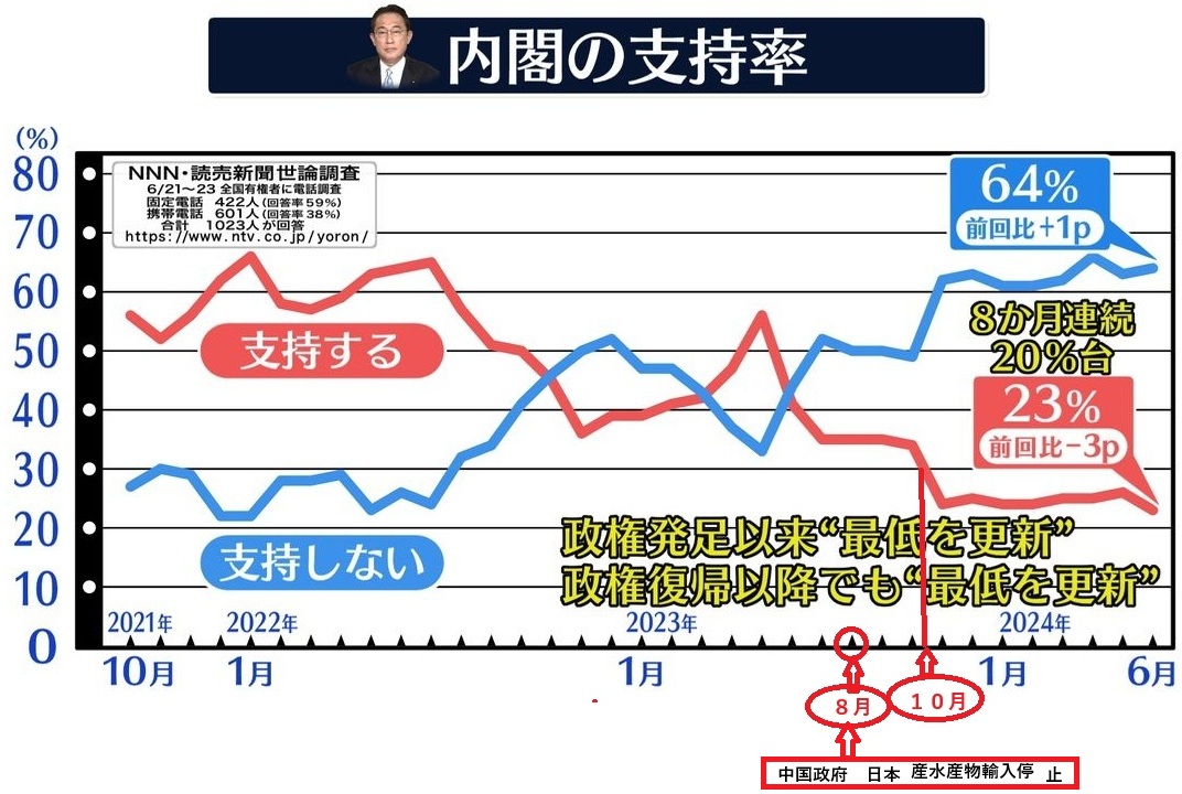 中国が輸入停止を通告した二か月後の2023年10月に岸田政権の支持率は30%を切って20%台前半まで急落しました。