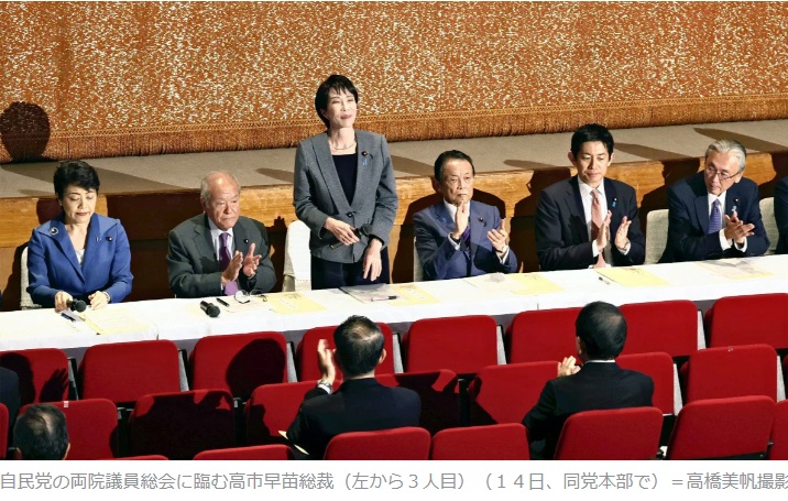 総会では高市に対する議員からの批判はほぼ出なかったという。議員たちは公明党の連立離脱ショックが大きすぎて言葉もなかったのだと思われる。