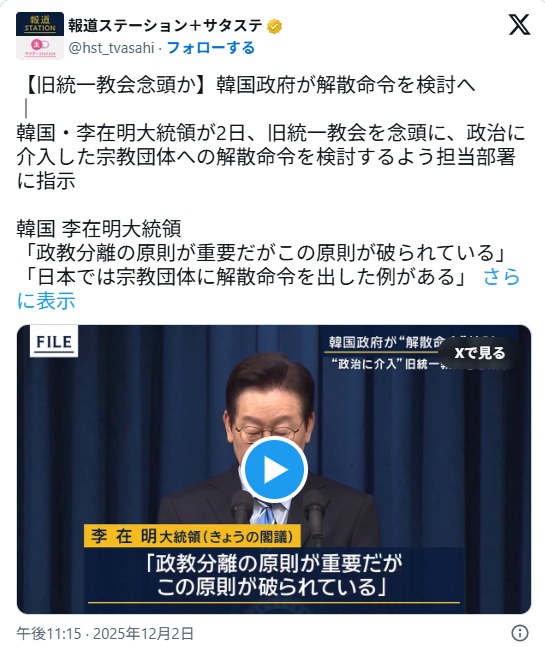 韓国、李在明政権が後押しする統一教会解散命令