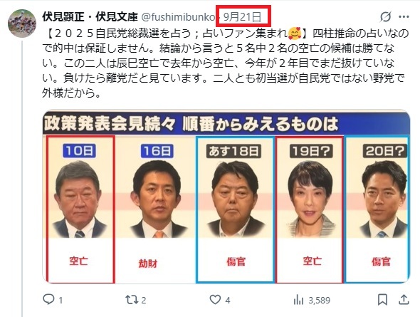 総裁選前の私の予想は外れたましたが総裁選で「勝ち組」に回った高市と茂木の空亡は未だ続いてます。
