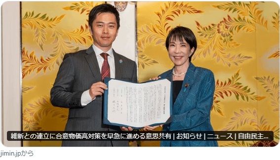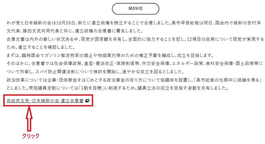 自民党と維新の政策合意書はどこにあるのかな?文末の赤で囲んだ箇所をクリックしてください。