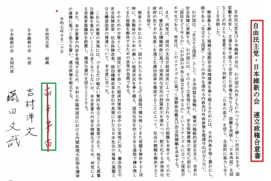 「自由民主党・日本維新の会 連立合意書」と言う計8項の文書が出てきます。如何にも「安普請」な合意書ですな(笑)
