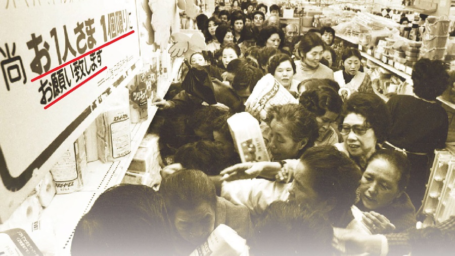 画像は第一次オイルショックの狂乱物価による主婦のトイレットペーパー買占め(日経ビジネス電子版)