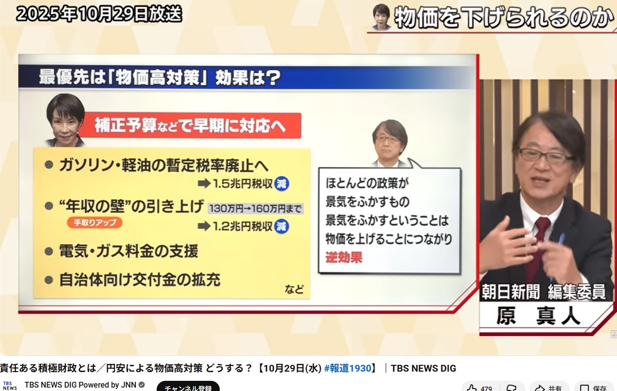 原真人朝日新聞編集委員が言う様に高市の政策は悪性インフレのさなかに「景気をふかす」メニューばかりで呆れます。我々が中学や高校で教わった中三の公民、高校の政治経済(私の頃は今は現代社会らしい)の授業のレベルの常識で「高市の経済音痴ぶり」に呆れます。高市早苗は本当に高校を卒業しているのだろうか?