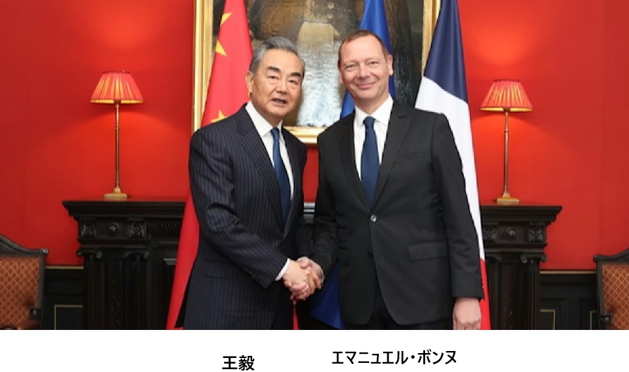 中国の王毅外相は27日、フランスのエマニュエル・ボンヌ大統領外交顧問と電話会談を行った。