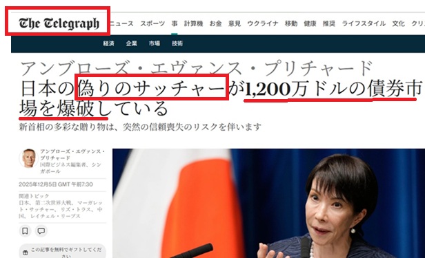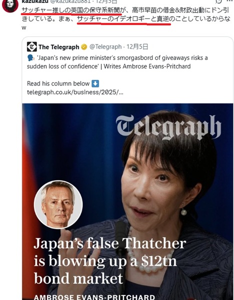 イギリスの保守系主流新聞、ザ・テレグラフ(日本で言えば読売新聞)が高市を「偽サッチャー」と断定し同時に