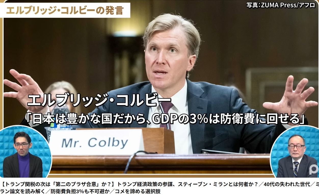 2025年3月コルビーはアメリカ議会の公聴会で日本の防衛費の増額を要求