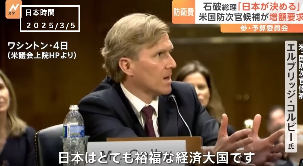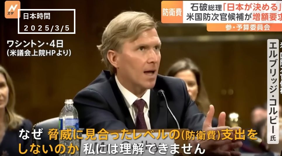 2025年3月コルビーはアメリカ議会の公聴会で日本の防衛費の増額を要求
