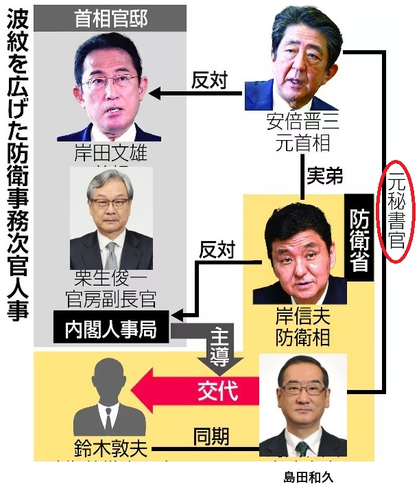その意趣返しに岸田総理は安倍の秘書官(6年間と言う最長記録)だった島田和久防衛事務次官を交代させました。