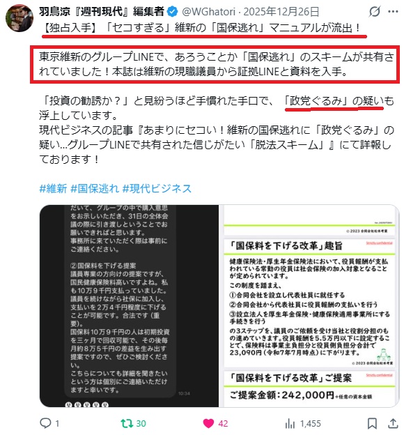 「安倍派裏金疑獄」以来のバッジが釣れるか?それにしても悪質だな~詳細は週刊現代へ。#維新 #国保逃れ #現代ビジネス