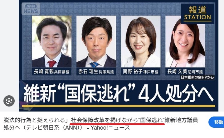 そのほか、昨年7月には東京都内の地方議員や都内を拠点とする国会議員らで組織する「東京維新の会」のLINEグループで、同様の手法で保険料を引き下げることへの勧誘が行われていたことも公表した。(転載ここまで)