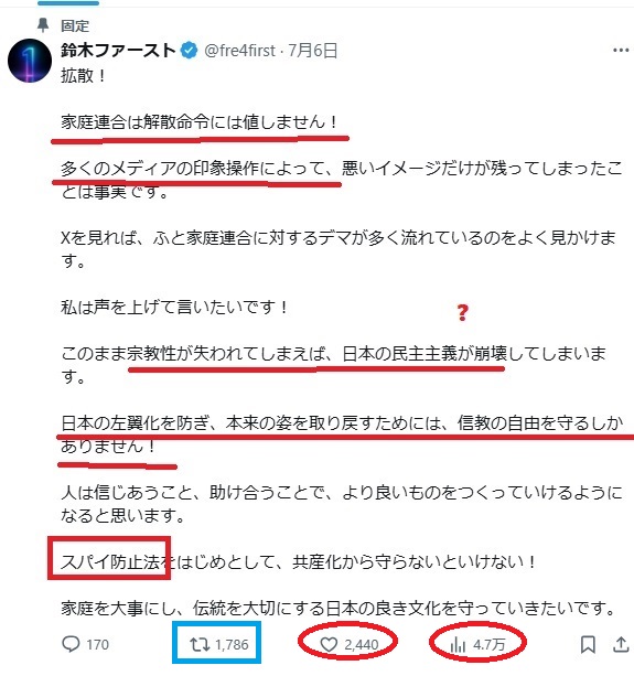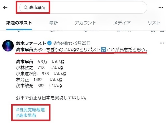 トレンドワードの高市早苗を検索すると。「高市マンセー」の投稿が出て来る。鈴木ファーストと言う垢は統一教会専門ジャーナリストの鈴木エイト氏をおちょくったものに違いありません。