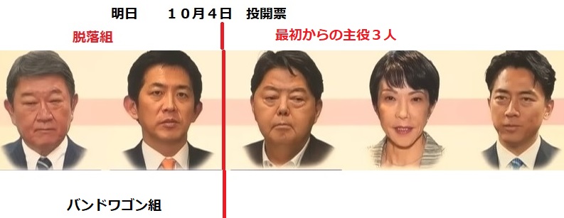 10月3日時点で確定的な事実は茂木、小林両候補はほぼ100%脱落組です。残りの3人の内、誰か一人が一回目で過半数を取れば最低3年は冷や飯です。