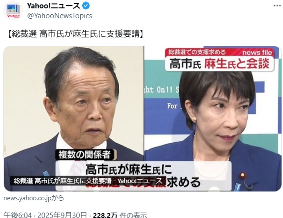 そういう意味では、今度勝ち馬に乗る…、というか自分が乗ったことによって、その人が総理総裁になる。そういう状況を作りたいんじゃないかと思います」と高市氏を支持する可能性はないと推測した。(転載ここまで)