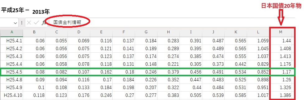 2013年4月の1・17%。第二次安倍政権でアベノミクスがスタートし黒田日銀総裁が「黒田バズーカ」と言って日銀が20年物国債を買い漁りました。