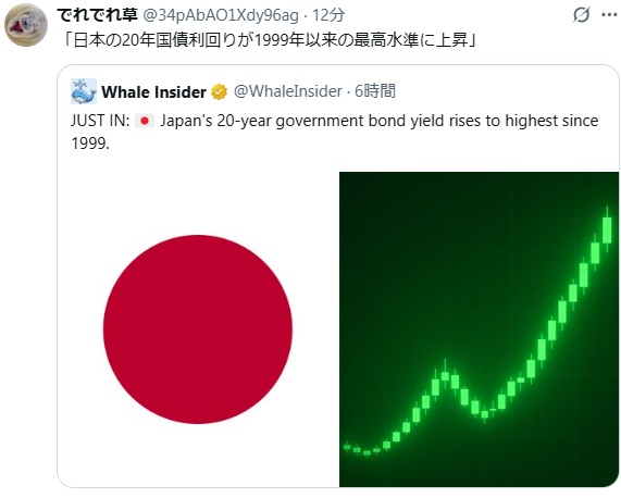 昨日アメリカ人の日本国債のトレーダーの投稿を読んで嫌な予感がしました。「日本国債20年物の利回りが1999年以来(26年ぶり)の最高水準に達した」との事です。