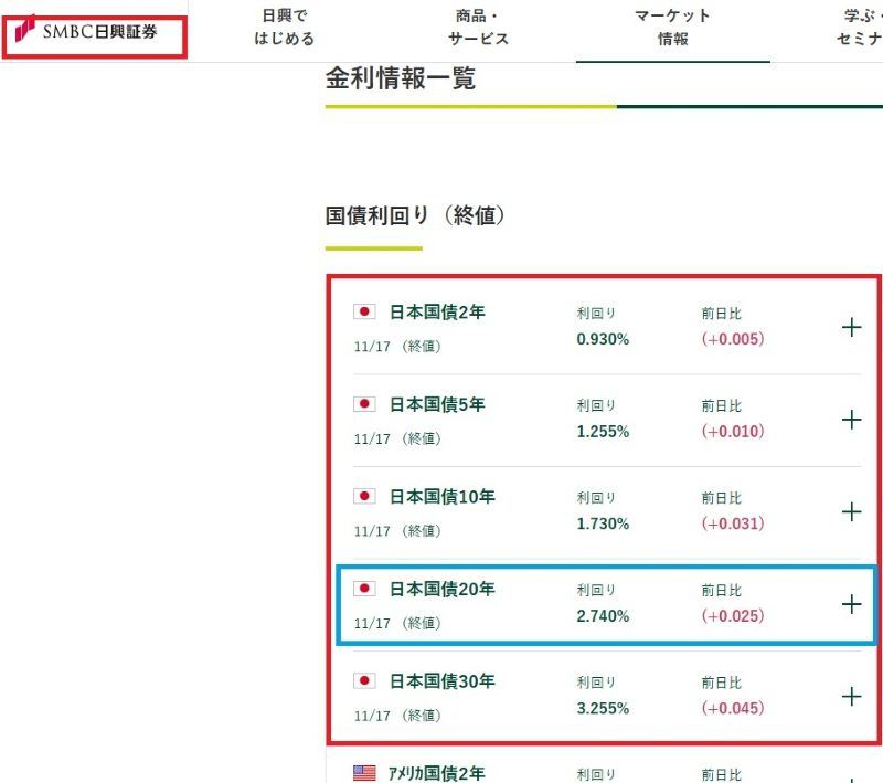 SMBC日興証券のHPで確認することができる。下記に日本国債20年と有るが「利回り;2・74%、前日比(+0・025)」とあります。