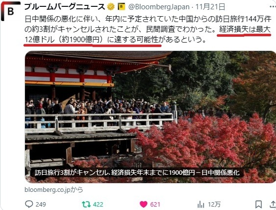これも円安要因 中国訪日旅行客キャンセルによる経済損失MAX1900億円