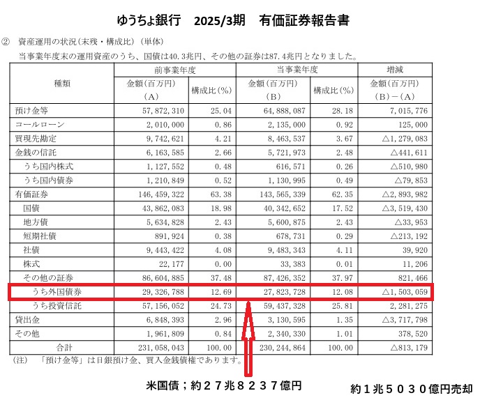 ゆうちょ銀行が2025年3月末時点で米国債を約28兆円も保有しています。