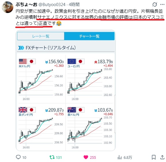 私は今回の利上げを高く評価したいです。これでサナエノミクスは半壊です。御愁傷さまでした(笑)