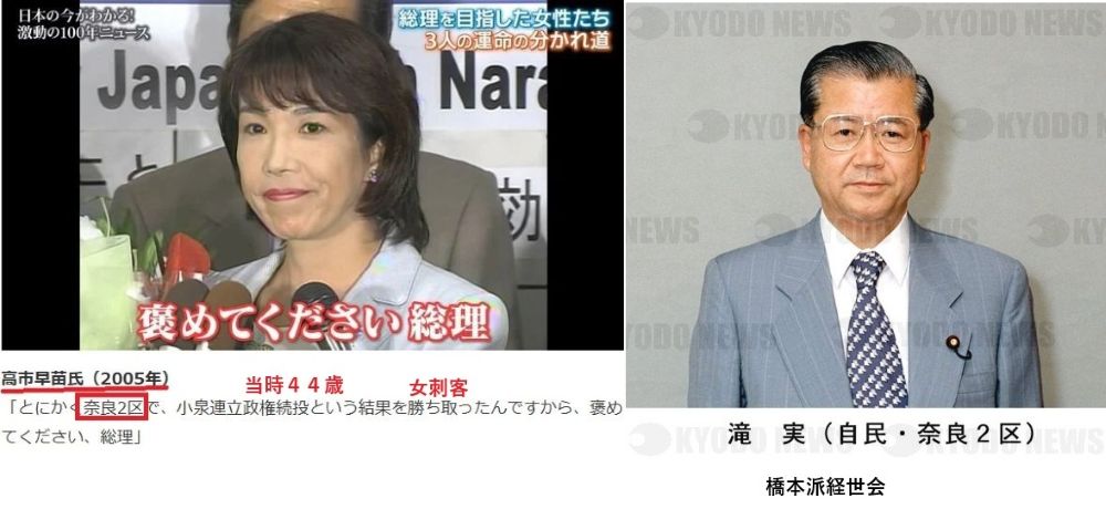 尚、高市が転出した後の奈良1区は「希望の党騒動」で馬淵澄夫が落選した2017年の衆院選を除き地道な市民活動を積み重ねる馬淵(民主党→立憲民主党)が現在も再選を重ねており自民党に議席は戻っていません。