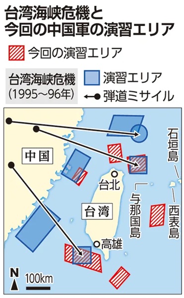 右側の図は怒った中国側の軍事演習での台湾周辺海域へのミサイル発射とその海域