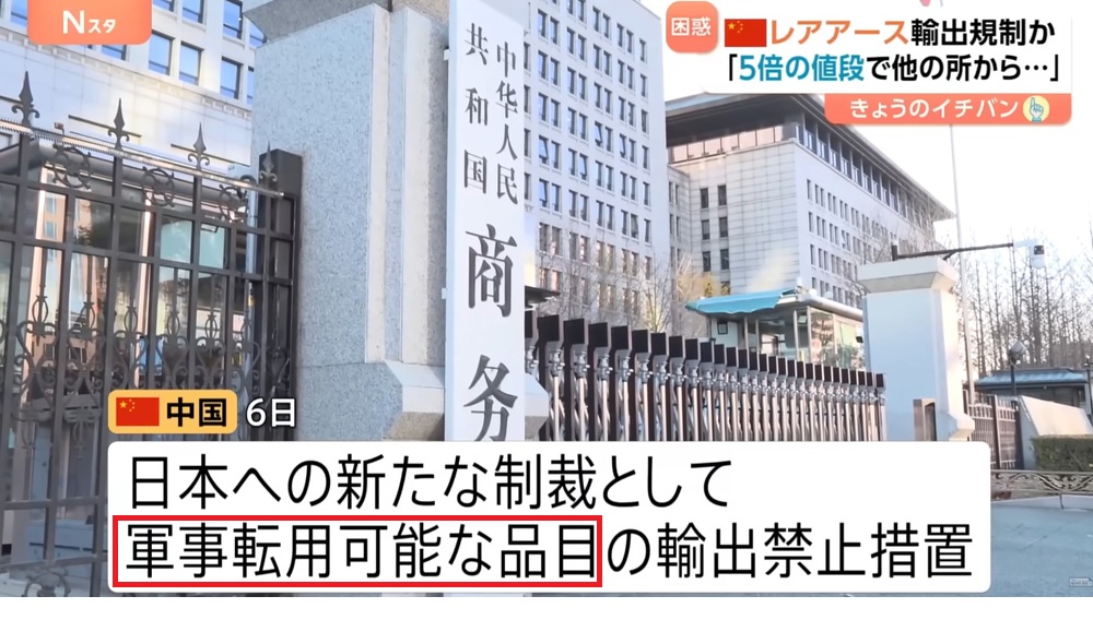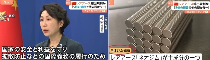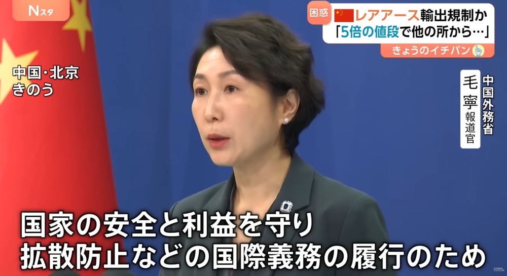 画像は中国産レアアースの「対日輸出規制の厳格化」とその根拠を述べる中国外交部の毛寧報道官
