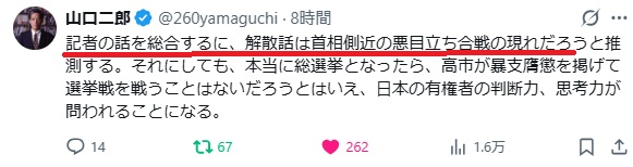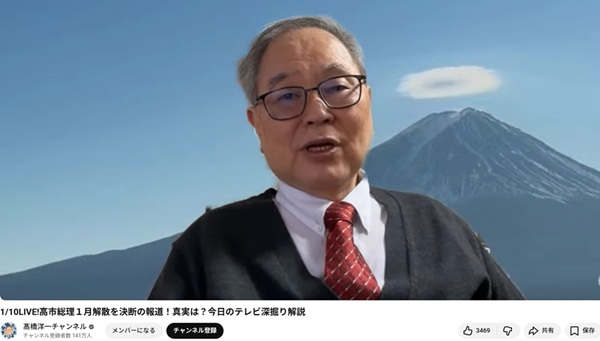 高橋は去年から「支持率の高いうちに解散するべき」と臨時国会冒頭解散を自分のYou tubeチャンネルで執拗に唱えていました。