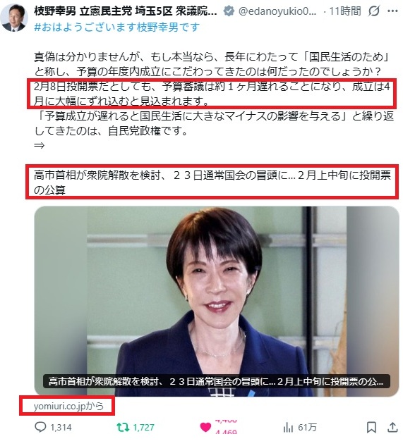 枝野幸男氏の投稿(読売報道)をベースに解析すると投開票は2月上旬か中旬なので来年度予算の年度内成立は到底無理で4月末かGW明け。