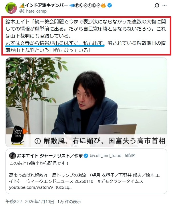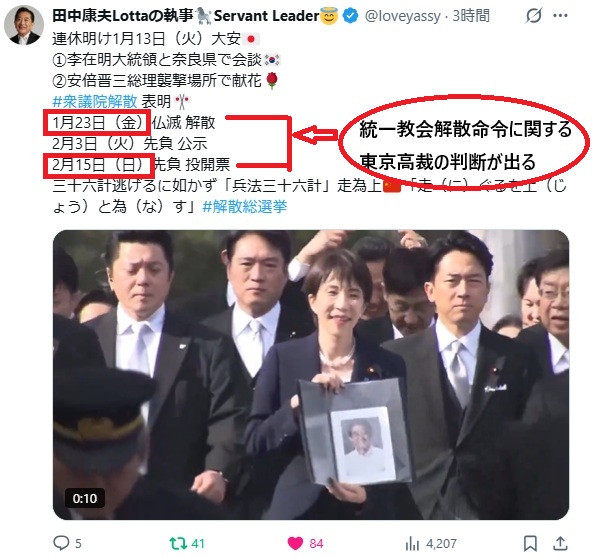 東京高裁が地裁の解散命令を追認するなら高市信者の「壺議員」が大量落選するのは自明です。地裁判決を棄却したなら世間は高市が高裁に圧力をかけたと見るでしょう。