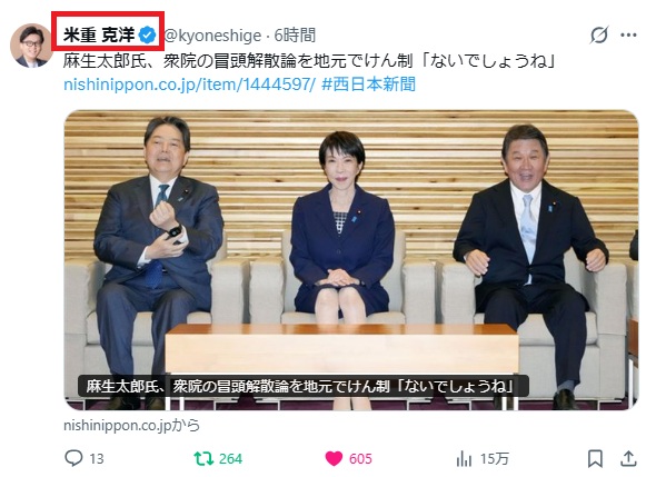 米重氏本人はオリジナルコメントなしですが「冒頭解散無し」に同意が無ければリポストしないでしょうからね。