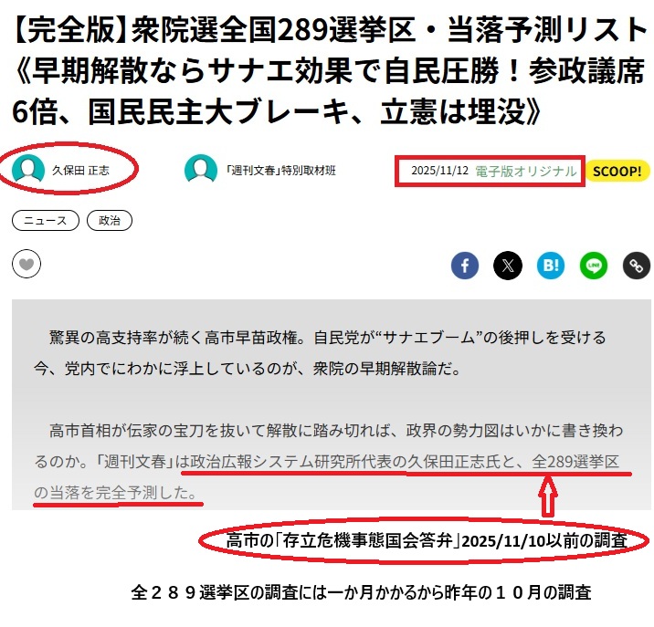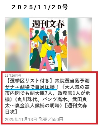 スクープと銘打っていますが2025/11/12電子版オリジナルとあるように昨年の10月末販売の紙の週刊文春の衆院選予測の特集記事です。