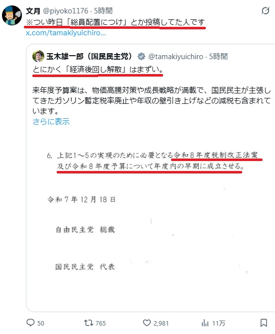 玉木雄一郎が高市早苗に対して掌返しを行った。通常国会冒頭解散の否定を国民民主党全議員にXで通達。
