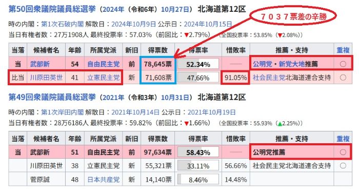 2024年の衆院選では立民候補と7037票差の辛勝。公明の基礎票が1万票とすると武部の実力は得票数からそれを引くと68645票で公明票が1万票川原田に乗ると所謂「行ってこい」で81608票で約1万2千票差で逆転負けとなります。