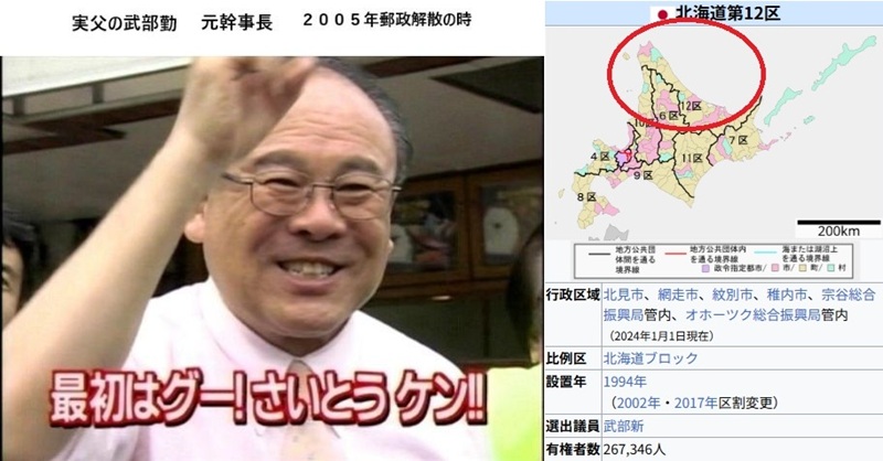 左が実父でこのキレキレの選挙コピーで初出馬の斉藤健を見事に落選させた話は有名です。北海道12区は岩手県とほぼ同じ面積で日本一広い小選挙区です。