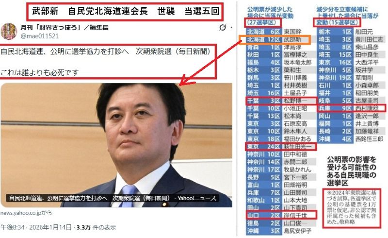毎日が落選候補に選んだ武部新が北海道連会長として公明党に助けを求めています。あれ?おかしくない?