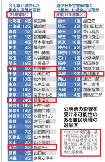 このアカウントの方の予想に大いに同意です。衆院選の度に毎回、公明票で辛うじて比例復活している議員は特に麻生派、茂木派「派閥横断の魔の五回生」に多い。