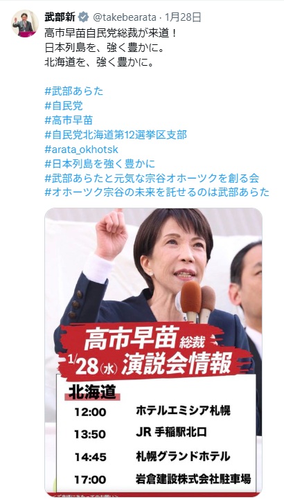 高市のXから、遊説は札幌市中心です。写真からわかる様に暖かい室内が多い。高市が応援に回る条件は