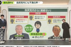 こんな綱渡りで果たして解散にこぎつられるだろうかと田崎氏は疑問を持つ。高市の後ろ盾の麻生太郎・自民党副総裁が事前に相談がなかったことでへそを曲げていて地元新聞の取材に「(解散)ないでしょうね」と冷ややかだ(転載ここまで)