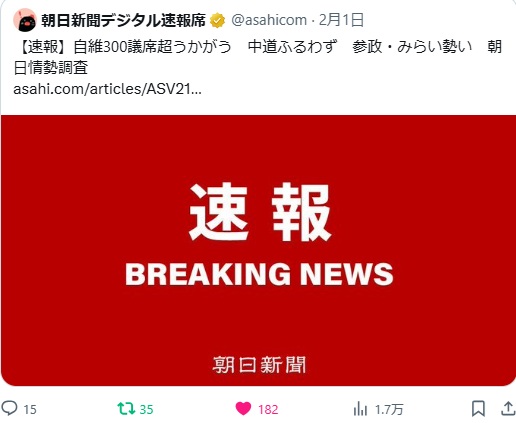 朝日新聞は2月1日になって、それまで各小選挙区の情勢調査を積み上げて、自民が相当数の議席を失うと言う一貫した予想をまるで「掌返し」の様に