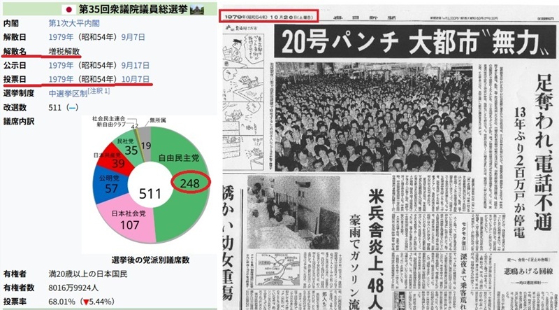第一次大平内閣の1979年の衆院解散。投開票日の10月7日に大型台風20号が西日本を直撃。投票率が下がり自民は追加公認を入れても過半数を割った。