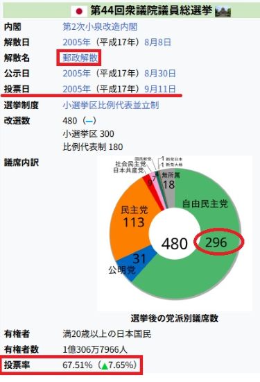 但しこの時は自公連立で自民単独では296議席でした。しかも投開票日はは9月11日と温暖で外出には最適な季節でした。