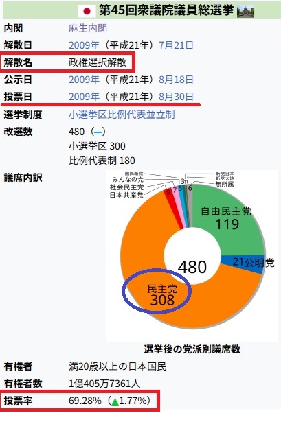 2009年の民主党に政権交代した衆院選。民主党単独で308議席獲得。投票率はほぼ70%の69・3%で小選挙区制になって最高投票率でした。