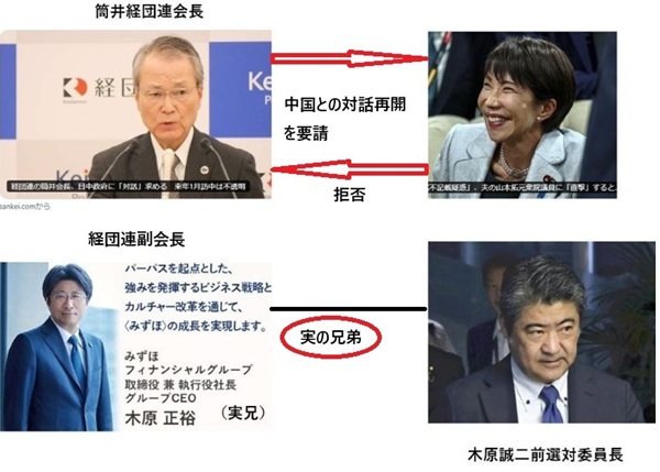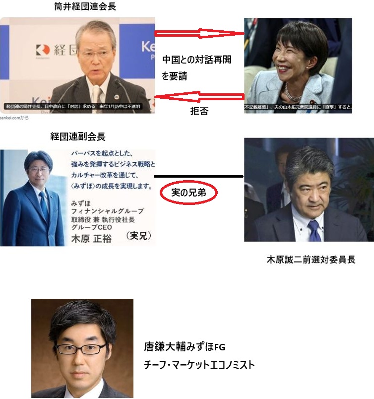 年末に筒井経団連会長が高市に中国政府との対話努力を要請したが高市は「財界総理=経団連会長」の要請を無視した状態が続いている。